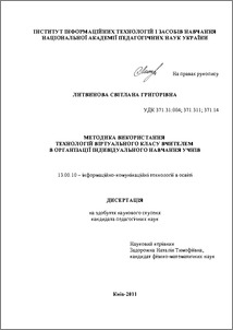 The dissertation for the degree of candidate of pedagogical sciences, speciality 13.00.10 – information-communication technologies in education. – Institute of Informational Technologies and Learning Tools of NAPS of Ukraine. – Kyiv, 2011. The thesis is a theoretical and experimental research of learning problem to children who don't attend school durable time. It is devoted to reason to use the virtual class technology by the teacher for individual student training. There are theoretical approaches to the virtual class formation are studied, the thesis subject foreign sources analysis is carried out and it is concluded that the virtual classes are more and more popular abroad, however scientists usage of the virtual classes is researched insufficiently. The analysis of terms “virtual”, “the virtual class”, “technologies of the virtual class”, “individual training”, “and training individualization” is carried out. Structure of ICT competence teacher is developed, criteria ICT competence framework is generalized, ICT competence teacher assessment questionnaires are developed in research. Practical results of the research are: developed methodology is deployed at high school. It includes: guidelines to use virtual class, the requirements to lesson and, binary lessons technique etc.