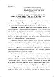 У статті на основі теоретичного аналізу встановлюються істотні ознаки естетичного досвіду, обґрунтовуються критерії та показники його сформованості в контексті професійної підготовки учителів-філологів.