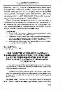- Пазюра, Н.В. (2011) Ідеї розвитку людського капіталу в батишевській виробничій педагогіці та внутрішньофірмовому навчанні виробничого персоналу японських підприємств П'яті міжнародні наукові читання, присвячені пам'яті академіка Сергія Яковича Батишева (Том 2). pp. 311-321.