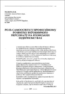 - Пазюра, Н.В. (2013) Роль самоосвіти у професійному розвитку виробничого персоналу на японських підприємствах Міжнародні Челпанівські психолого-педагогічні читання ( з нагоди 100-річчя заснування Психологічного інституту Г.І. Челпановим), Том 5. pp. 249-255.
