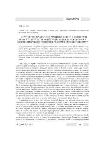 - Суший, О.В. (orcid.org/0000-0002-4364-7571) (2015) Strategic priorities for development of education in the context of evropean integration of Ukraine: Will the educational reform become the key to successful reforms in Ukraine in General? Український соціум, 4 (55). pp. 85-96. ISSN 1681-116Х