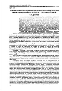 The article deals with the internationalization and transnationalization of higher education as the current global trends that places new demands on the quality of education, trends and level of training. It is noted that the modernization of European education was natural, since the geographical (the elimination of customs borders) and socio-economic (a single currency - the euro) transformation led to increased mobility of European citizens. Thoroughly justified the need for the European labor market in accordance with international standards development; recognition of diplomas and standardization of education. It is noted that the main goal of the Bologna reforms is to harmonize European architecture education through the creation of a pan handles quality and standards, transparency of qualifications and the desire to unite the scattered potentials in single economic mechanism. Confirmed the thesis that defines internationalization as a process of implementation of the international component of the research; educational and administrative functions of higher education. It is noted that at the stage of transnationalization University creates its branches, subdivisions, schools abroad. The conclusion that internationalization and transnationalization of education is logical manifestations of globalization.