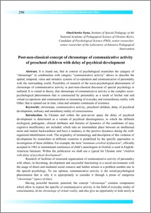 It is found out, that in context of psychological researches the category of “chronotope” in combination with category “communicative activity” allows to describe the spatial, temporal, value and semantic systems of co-operation and communication of personality with the surrounding world. Possibility of research of the socio-psychological phenomenon of chronotope of communicative activity in post-non-classical discourse of special psychology is outlined. It is vested in theory, that chronotope of communicative activity is the complex socio-psychological phenomenon that is constructed by personality as a result of his/her real and virtual co-operation and communication in measuring of everyday and extraordinary reality with Other, that is opened out in time, value and semantic continuum of existence.