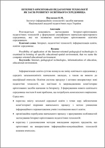 - Науменко, О.М. (2012) Internet-oriented pedagogical technologies as means of development of educational environment In: Засоби і технології сучасного навчального середовища: Матеріали Міжнародної VIIІ (XVIIІ) науково-практичної конференції . ПП "Ексклюзив-Систем", м.Кіровоград, Україна, pp. 106-108.