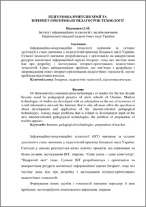 - Науменко, О.М. (2012) Preparation of teachers of chemistry and internet-oriented pedagogical technologies In: Актуальні проблеми природничо-математичної освіти в середній і вищій школі . Херсонський державний університет, Україна, Херсон, Україна. (Submitted)