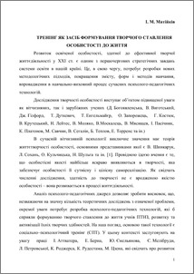 - Матійків, І.М. (2010) Training as a method of forming a creative attitude to life In: Pedagogical interaction of secondary, vocational and higher educational institutions . Phop Korpan B. I., м. Львів, Україна, pp. 83-92.