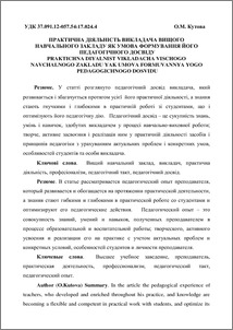 - Кутова, О.М. (2014) Практична діяльність викладача вищого навчального закладу як умова формування його педагогічного досвіду Вища освіта України. Педагогіка вищої школи: методологія, теорія, технології. Том ІІ, 3 (54). pp. 157-161. ISSN 2078 - 1016