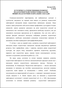 Естетичні та етичні чинники розвитку педагогічної майстерності викладачів вищих педагогічних навчальних закладів сприятимуть якості краси педагогічної дії, що стимулюватимуть неперервне професійне зростання як студентів, так і самих викладачів цих закладів, а також зумовлюватимуть усвідомлення ними себе не лише як предметників, що мають навчити студентів певної навчальної дисципліни й уміти перевірити якість її засвоєння ними. Педагогам варто пам’ятати, що важливими в естетизації навчання і виховання є не лише дисципліни гуманітарного циклу, але й інші предмети. Таким чином,викладачі стануть для студентів педагогами-майстрами, які прагнуть стати для них учителями життя, залишать яскравий і незабутній слід у їхніх душах і зможуть показати шлях до особистісної самореалізації та фахового росту у будь-якій життєвій діяльності.