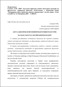 - Семеног, Олена Миколаївна (2007) Actual problems of language training masters on the faculties of philology language Педагогічні науки: "Неперервна освіта: проблеми, пошуки, перспективи": зб. наук. праць (1). pp. 208-213.