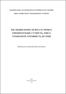Scientific-methodical manual is an attempt to analyze euro integration processes in modern theory and practice of postgraduate pedagogical education. Various scientific-methodical materials devoted to theoretical interpretation of European measuring and competence attitude in pedagogical education, analysis of axiology aspects of projecting curriculum in the context of European integration and also, characteristics of the best national practices of euro integration activity, widen informative field and help deep understanding of principles and dynamics of the development of integration processes to education in conditions of globalization. Manual includes variable factorial material about forming readiness of system of postgraduate pedagogical education staff to European values and intercultural interaction perception. It is for elaborators of educational policy, managers of educational institutions, scientists, lecturers, teachers, postgraduates, students of postgraduate education.