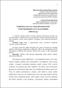- Шевченко, В.М. (orcid.org/0000-0003-0119-3206) and Савчук, О.А. (2012) The development of an institution for educating children with hearing impairment in Bukovina (1908-2012 years) Дитина із сенсорними порушеннями: розвиток, навчання, виховання (3). pp. 106-112. ISSN 978-966-644-289-8