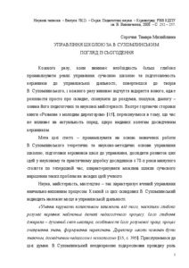 On the basis of the analysis of heritage V. Sukhomlinsky presents the theoretical and methodological approaches to the management of general educational institutions. The author highlights the scientific achievements of followers V. Sukhomlinsky, since the 70s of the last century to the present day, characterizes the possible solutions to the problems of modern school management based on the ideas of the outstanding scientist, teacher, draws attention to the different aspects of the management activities of the school director, shows the main stages and especially developed and tested a new technology professional development of secondary school leaders in the system of postgraduate education - scientific and methodological support.