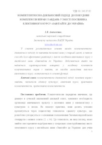 - Алєксєєнко, Ірина Вікторівна (2016) Competence and activity approaches to exercise and task complax construction in the content of the elective course manual "Welcome to Ukraine" Проблеми сучасного підруника (16). pp. 6 -16.