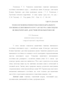 This article considers the elective courses to be the part of profile education at high school. Elective courses content expand students’ knowledge, integrate scientific knowledge with common one and raise their personal experience on scientific level. This means strengthening of the personal orientation of teaching at school. The main tasks of the elective course textbook “Culture and Art of Great Britain” are to familiarize high school students with culture and art of Great Britain, enabling them to learn more about the national heritage of the country by expanding the scope of the information field and authentic use of English in the overall educational environment; to achieve educational goals thanks to the introduction to the history and culture of the country and gaining new information on the people living abroad; to deepen knowledge and improve students’ sociocultural competence in teaching foreign language. The author describes the technology on determining the content of structural components (in particular, thematic modules and themes) in the elective course textbook in English “Culture and Art of Great Britain” for students of profile schools. The dominant role of the textbook, as the primary means of mastering elective course content by high school, is determined. Creation of the English-language textbook mentioned above should broaden and deepen the knowledge of 10–11 grades students about the culture of the country whose language is being studied. The content of this textbook is based on the students experience gained during their studying foreign language in elementary and primary school. Special attention is paid to the analysis on survey results of high school students and teachers of English language of educational establishments in Ukraine on the semantic content of the textbook as the basis for determining the content of its structural components.