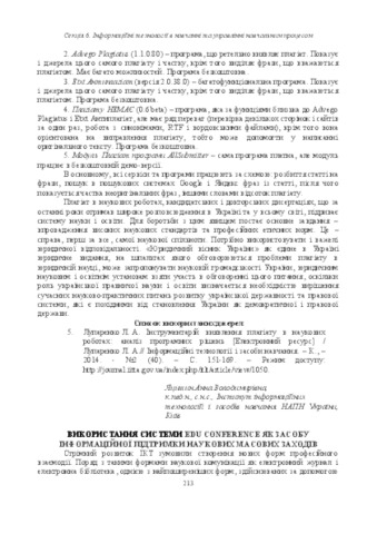 - Яцишин, А.В. (orcid.org/0000-0001-8011-5956) (2016) Use of EDUconference for support of scientific events In: Автоматизація та комп’ютерно-інтегровані технології у виробництві та освіті: стан, досягнення, перспективи розвитку: матеріали Всеукраїнської науково-практичної Інтернет-конференції . Черкаський національний університет ім. Богдана Хмельницького, м. Черкаси, Україна, pp. 213-215.