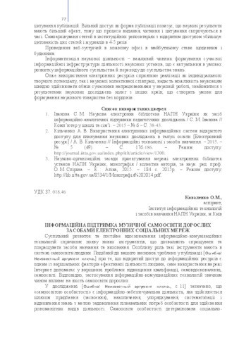 - Коваленко, О.М. (2016) Information support of musical self-education adults means of electronic social networks Звітна наукова конференція Інституту інформаційних технологій і засобів навчання НАПН України: Матеріали наукової конференції. pp. 77-82.