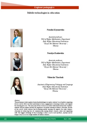 - Рашевська, Н. В., Кіяновська, Н.М. and Ткачук, В. В. (2016) Mobile technologies in education Metallurgical and Mining Industry, 5. pp. 40-43. ISSN 20760507