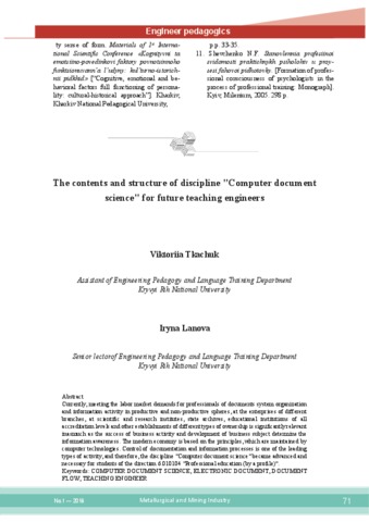 - Ткачук, В. В. and Ланова, І. В. (2016) The contents and structure of discipline "Computer document science" for future teaching engineers Metallurgical and Mining Industry, 1. pp. 71-74. ISSN 20760507