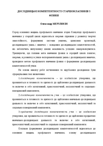 - Мерзликін, О. В. (2015) Physics Research competences of high school students In: Засоби і технології сучасного навчального середовища . Ексклюзив-Систем, м.Кіровоград, Україна, pp. 135-136.