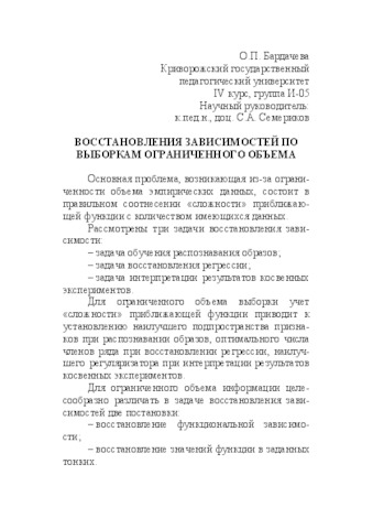 - Семеріков, С.О. and Бардачева, О. П. (2008) Addiction recovery from samples with limited volume In: Молодий науковець ХХІ століття: матеріали Міжнародної науково-практичної конференції (Кривий Ріг, 17–18 листопада 2008 р.) , 1 (1). Видавничий центр КТУ, м. Кривий Ріг, Україна.