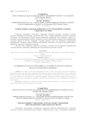- Литвинова, С.Г. and Биков, В.Ю. (2016) A corporate social network as an object of educational social system management Теорія і практика управління соціальними системами, 2. ISSN 2078-7782
