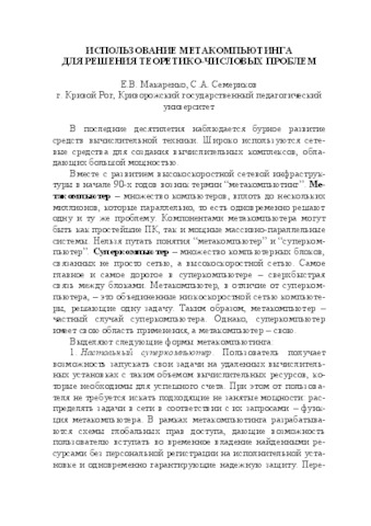 - Макаренко, Є. В. and Семеріков, С.О. (2003) Using meta-computing for number-theoretic problems solving ІІІ Всеукраїнська конференція «Сучасні технології в науці та освіті». pp. 24-27.