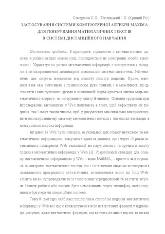 - Семеріков, С.О. and Теплицький, І.О. (2007) The application of computer algebra system Maxima to generate mathematical texts in distance learning Актуальні проблеми психології: Психологічна теорія і технологія навчання, 3 (8).