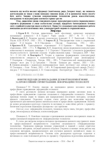 - Шалацька, Г.М. (orcid.org/0000-0002-1231-8847) (2016) The latest approaches to teaching a business foreign language according to professional orientation: information technologies Педагогіка вищої та середньої школи (48). pp. 97-102. ISSN 2304-4470