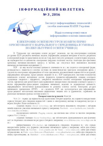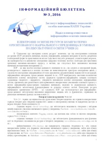 - Іванюк, І.В. (orcid.org/0000-0003-2381-785X) (2016) Electronic educational resources of computer-based learning environment in multicultural education of students. Informational bulletin №3, 2016 Insitute of Informational Technologies and Learning Tools NAES of Ukraine, м. Київ, Україна.