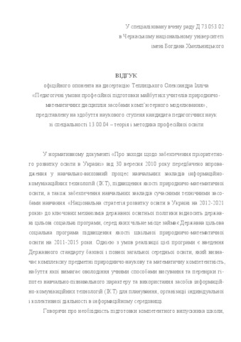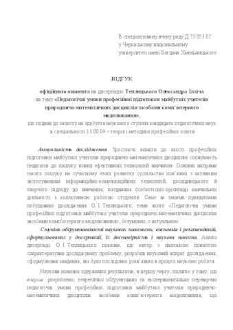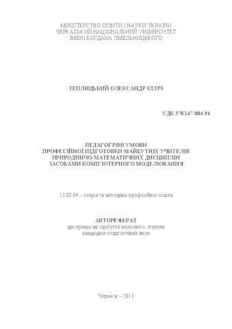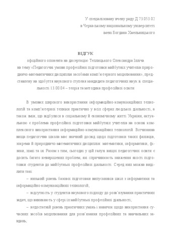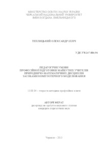 - Теплицький, О.І. (2013) Pedagogical conditions of training future teachers in natural sciences and mathematics by means of computer simulation Dissertation candidate2 thesis, Черкаський національний університет імені Богдана Хмельницького.
