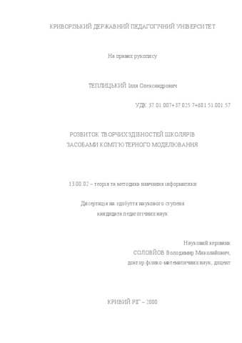 - Теплицький, І.О. (2000) Development of pupils’ creative capacities by means of computer simulation Dissertation candidate thesis, Криворізький державний педагогічний університет.