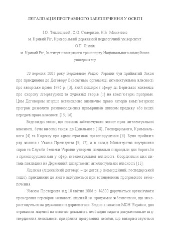 - Семеріков, С.О., Теплицький, І.О., Моісеєнко, Н.В. and Ліннік, О. П. (2007) The legalization of software in education Рідна школа, 2 (2).