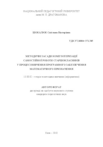 - Шокалюк, С.В. (2010) Methodical grounds of computer based approach to high school students’ self study work in the process of learning mathematically oriented software Dissertation candidate2 thesis, Національний педагогічний університет імені М. П. Драгоманова.