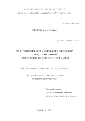 - Кислова, М.А. (2014) Development of a mobile learning environment in higher mathematics in training of Electromechanics Engineers Dissertation candidate thesis, ДВНЗ "Криворізький національний університет".