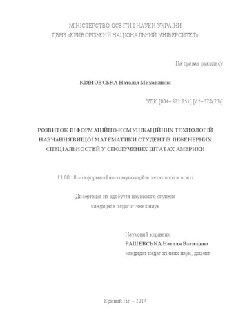 - Кіяновська, Н.М. (2014) The development of Information and communication technologies in teaching engineering students in universities of the United States Dissertation candidate thesis, ДВНЗ "Криворізький національний університет".