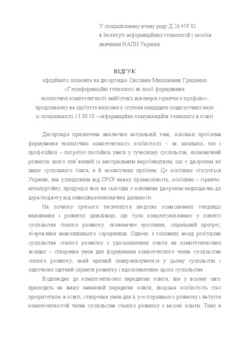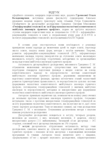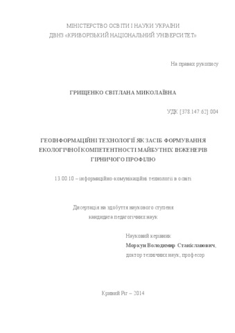 - Грищенко, С.М. (2014) Geoinformation technologies as a tool of ecological competence formation of the future Mining Engineers Dissertation candidate thesis, ДВНЗ "Криворізький національний університет".