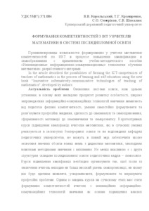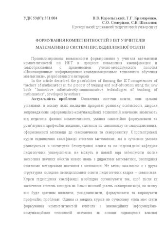 - Корольський, В.В. (orcid.org/0000-0002-7409-4201), Крамаренко, Т.Г., Семеріков, С.О. and Шокалюк, С.В. (2009) Formation of ICT competencies of teachers of mathematics in post-graduate education Педагогіка вищої та середньої школи (24). pp. 36-43. ISSN 2304-4470