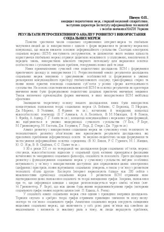 - Пінчук, О.П. (2016) The results of a retrospective analysis of the development and use of social networks In: Звітна наукова конференція Інституту інформаційних технологій і засобів навчання НАПН України . ІІТЗН НАПН України, м. Київ, Україна, pp. 209-211.