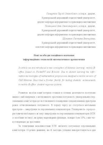 - Семеріков, С.О., Теплицький, І.О. and Шокалюк, С.В. (2008) New means of distance education information technology mathematics destination Вісник ТІМО. Тестування і моніторинг в освіті, 2. pp. 42-50.