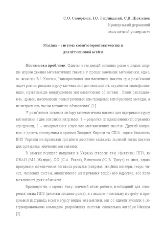 - Семеріков, С.О., Теплицький, І.О. and Шокалюк, С.В. (2008) Maxima - computer mathematics system for national education Науковий часопис Національного педагогічного університету імені М.П. Драгоманова. Серія №2. Комп’ютерно-орієнтовані системи навчання, 6 (13). pp. 32-39. ISSN 2411-8869