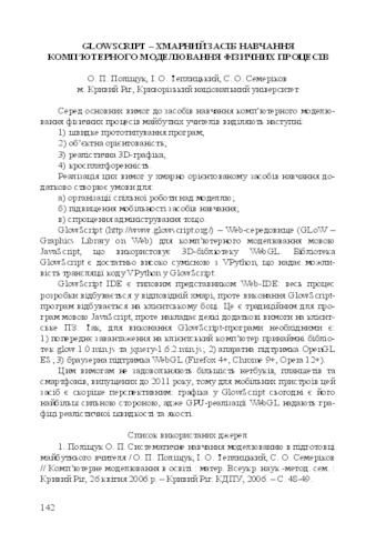 - Поліщук, О.П., Теплицький, І.О. and Семеріков, С.О. (2012) GlowScript - cloud based learning tool for computer simulation of physical processes In: Хмарні технології в освіті: матеріали Всеукраїнського науково-методичного Інтернет-семінару (Кривий Ріг – Київ – Черкаси – Харків, 21 грудня 2012 р.) . Видавничий відділ КМІ, м. Кривий Ріг, Україна, p. 142.