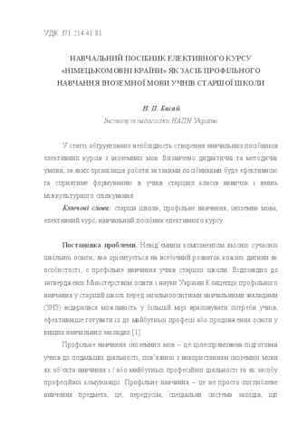 The necessity for creating educational manuals of elective courses in foreign languages is substantiated in the article. The author determined didactic and methodical conditions which would secure effective work according to these manuals and contribute formation of habits and skills for intercultural communication to senior students. The plan for the implementation of a new educational manual of elective course “German-speaking countries” into the process of profile teaching foreign languages is defined. This manual is creating in the department of teaching foreign languages in the Institute of Pedagogy of NAPS of Ukraine.