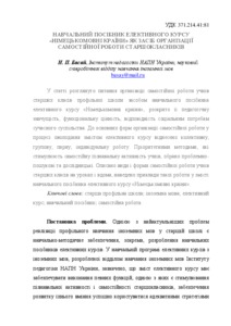 The problem of organizing independent work of senior students in profile school by means of the elective course textbook “German-speaking countries” is considered in the article. Its pedagogical significance, functional value and accordance to the social needs of modern society are revealed. According to the author it is advisable to actively implement the kinds of independent work in the content of elective courses textbooks in foreign languages, taking into account individual characteristics, prospects of upper school students’ development and self-development and promoting the development of their abilities. Collective, group, pair and individual work are the basic forms for organization of independent work in the process of mastering the content of the elective course. Problem-searching and research methods are selected as the priority methods that stimulate independent cognitive activity of students. It is underlined the increase of priority to interactive methods, in particular to a cooperative method, a method of projects, a method of introduction of the newest information and communication technologies, in accordance with the communicative approach to teaching foreign languages and taking into account educational and vital experience gained by the students. It is indicated that a part of independent work with different sources of information, including the Internet, should be significant. The author pays attention to increasing the role of students’ independent work, that is predefined by their creative activity related to the foreign language. Except traditional lessons, practical works, seminars, lectures, the forms of organizing studies, that will assist effectively the development of abilities for upper school students’ independent work, are defined: interactive lessons, lessons-projects, lessons-excursions, lessons with the use of Internet resources, competitions, conferences, brain-rings, multimedia presentations, etc. Types and forms of independent work for students of upper school forms in class and at home are described, examples of such work in the content of the elective course textbook “German-speaking countries” are proposed.
