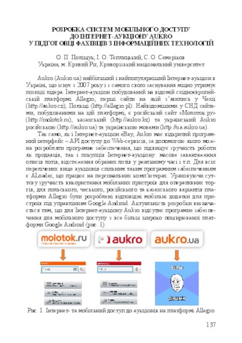 - Семеріков, С.О., Теплицький, І.О. and Поліщук, О.П. (2012) Development of mobile access to the Internet auction Aukro in training professionals In: Новітні комп’ютерні технології: матеріали X Міжнародної науково-технічної конференції: Севастополь, 11–14 вересня 2012 р. , 1 . Мінрегіон України, м. Київ, Україна.
