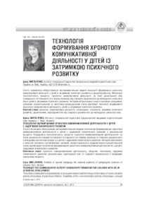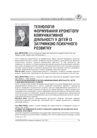 - Омельченко, Ірина Миколаївна (2015) Technique for communicative activity chronotope formation for children with delay of mental development Особлива дитина: навчання і виховання, 2. pp. 59-66. ISSN ISSN 2312-2781