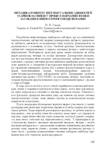 - Єчкало, Ю.В. (2012) Methods of development of intellectual abilities of high school students in learning physics by means of computer simulation In: Новітні комп’ютерні технології (10). Мінрегіон України, м. Київ, Україна, pp. 109-110.