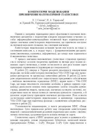 - Словак, К. І. and Хараджян, Н. А. (2012) Computer modeling in the study of mathematical statistics In: Комп’ютерне моделювання в освіті: матеріали V Всеукраїнського науково-методичного семінару (Кривий Ріг, 6 квітня 2012 р.) . Видавничий відділ НМетАУ, м. Кривий Ріг, Україна, pp. 36-37.
