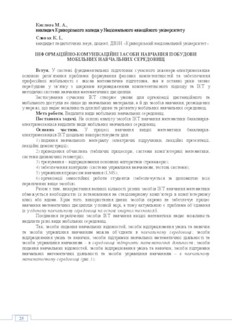 - Кислова, М.А. and Словак, К. І. (2014) Information and communication learning tool constructing mathematical mobile environments In: Звітна наукова конференція присвячена 15-річчю Інституту інформаційних технологій і засобів навчання ІІТЗН НАПН України . ІТЗН НАПН України, м. Київ, Україна, pp. 25-26.