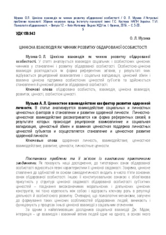 - Музика, О. Л. (2016) Value interaction as a gifted personality’s development factor Актуальні проблеми психології: Збірник наукових праць Інституту психології імені Г.С. Костюка НАПН України. Т.VІ: Психологія обдарованості, 12. pp. 5-20. ISSN 2072-4772