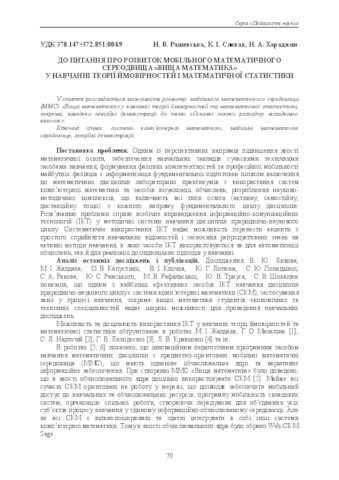 - Рашевська, Н. В., Словак, К. І. and Хараджян, Н. А. (2012) The development of mobile mathematical environment «Higher Mathematics» in teaching the theory of probability and mathematical statistics. Вісник Черкаського університету. Серія педагогічні науки, 36 (249). pp. 79-86. ISSN 2076-586Х